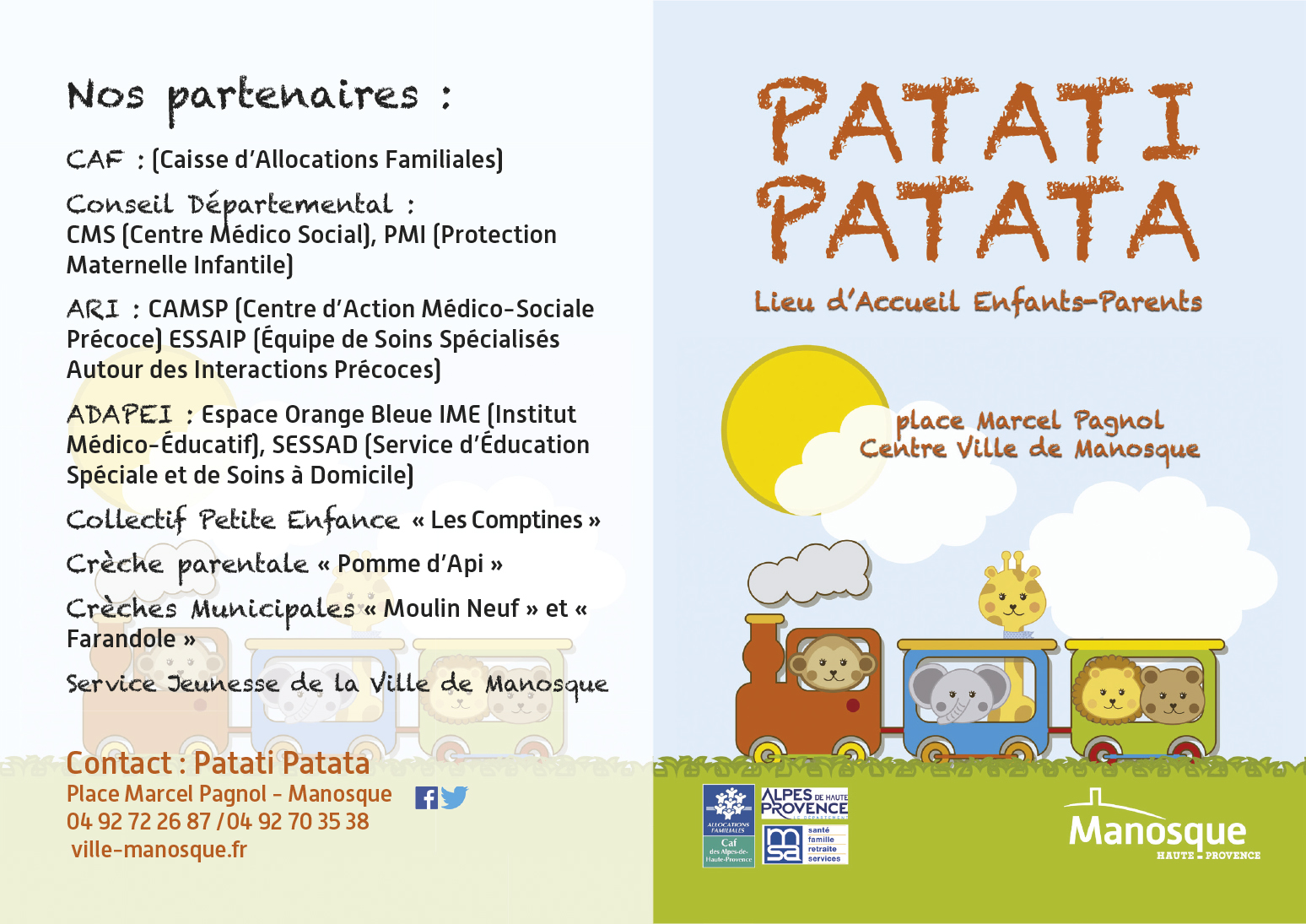 Pour les familles: Accueil, accompagnement des parents en recherche de mode de garde, accompagnement dans leur fonction d'employeur, mise à disposition d'ateliers de jeux avec son enfant, actions parentalité communes proposées avec les parents de la crèche.